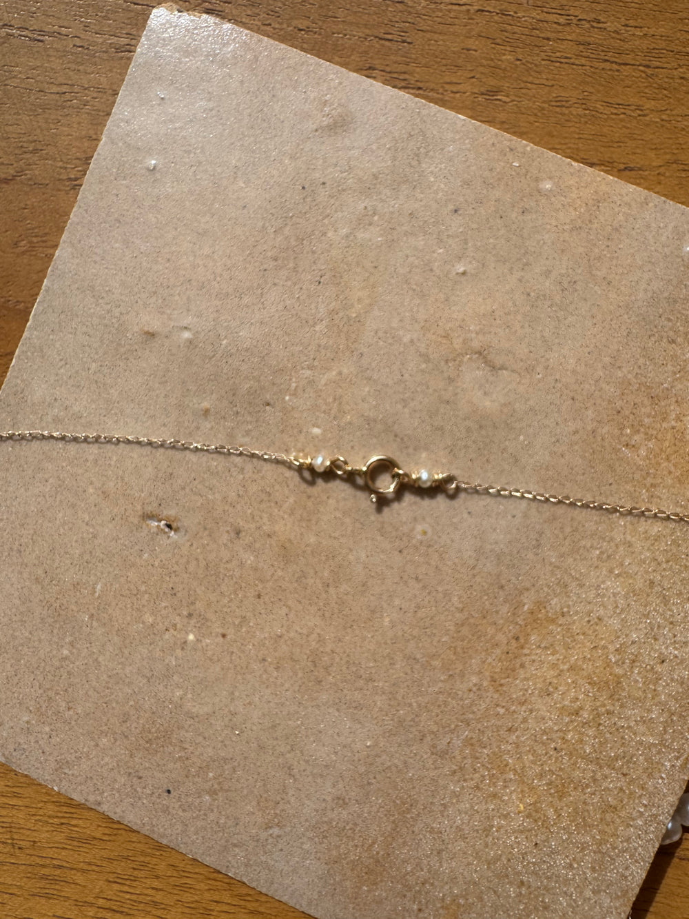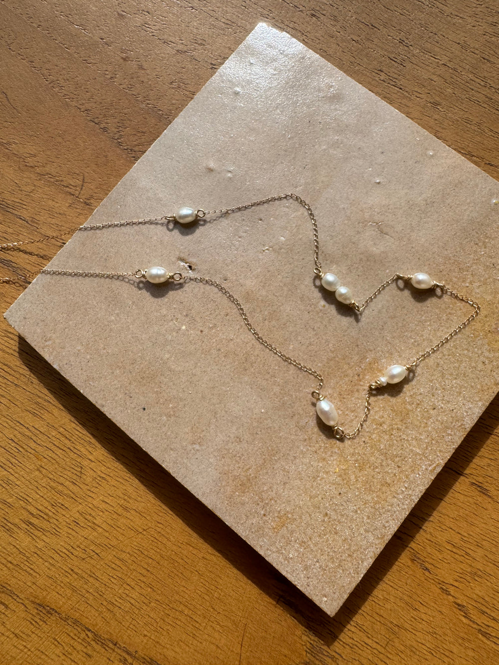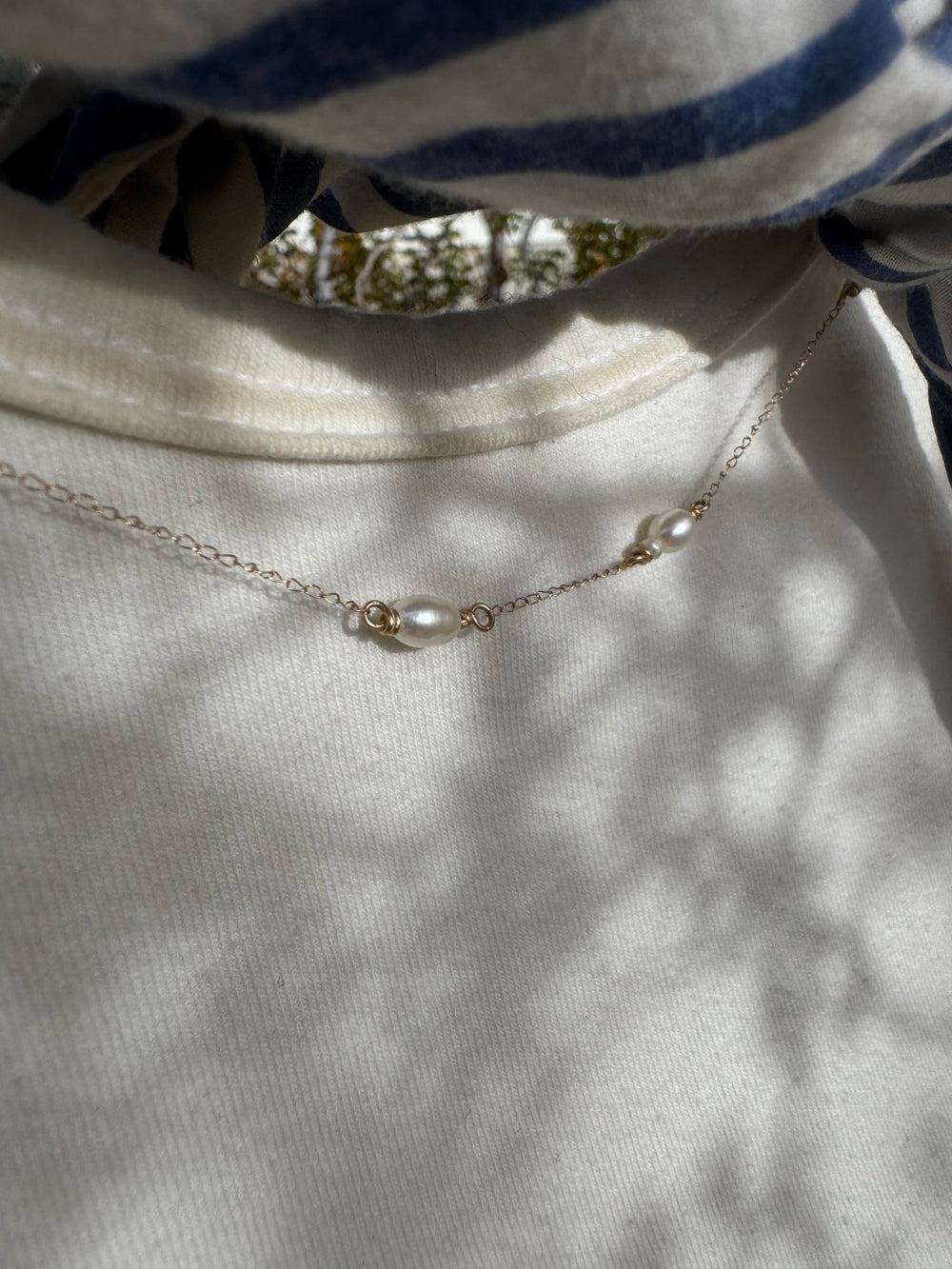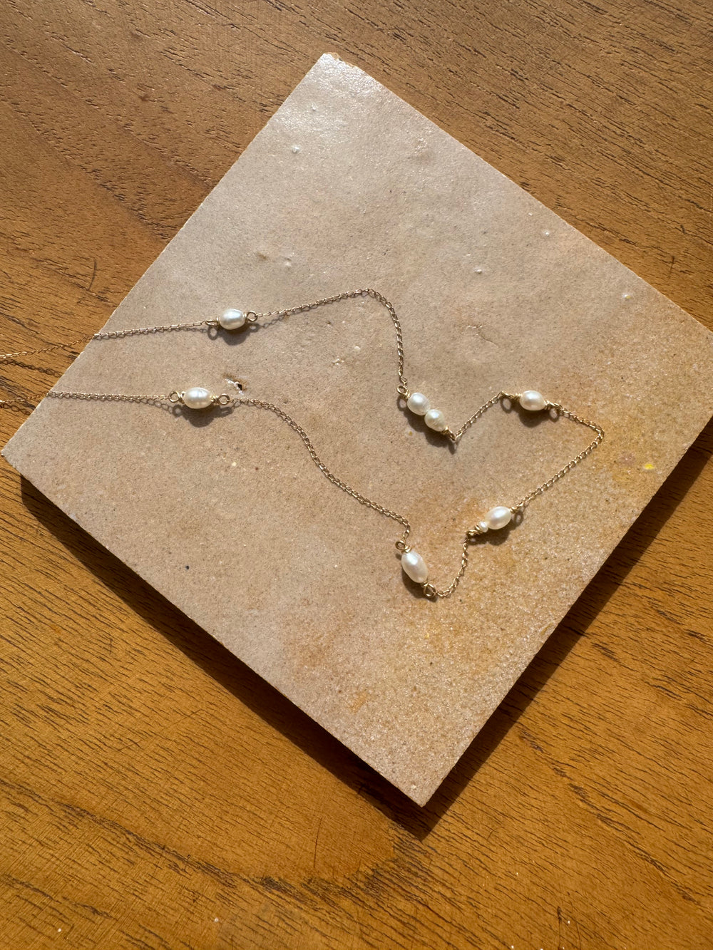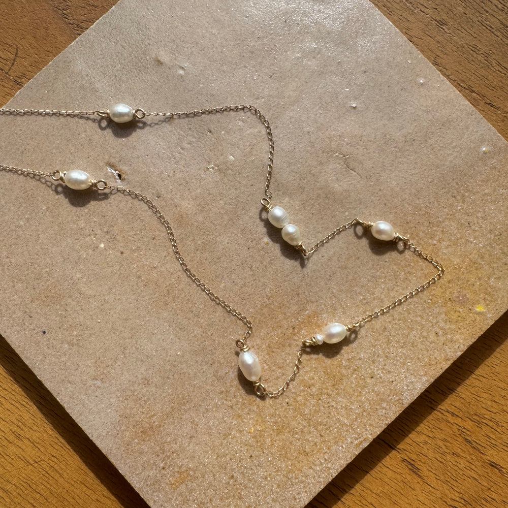 Delicate, collar bone resting gold and pearls! This sweet little necklace looks like pearls are floating against your skin. All chain and wire is solid 14K gold, delicate curb chain is light and lovely.